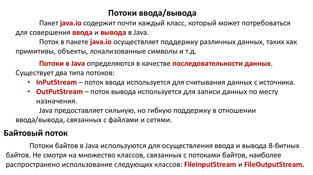 Поток в пакете java.io осуществляет поддержку различных данных, таких как