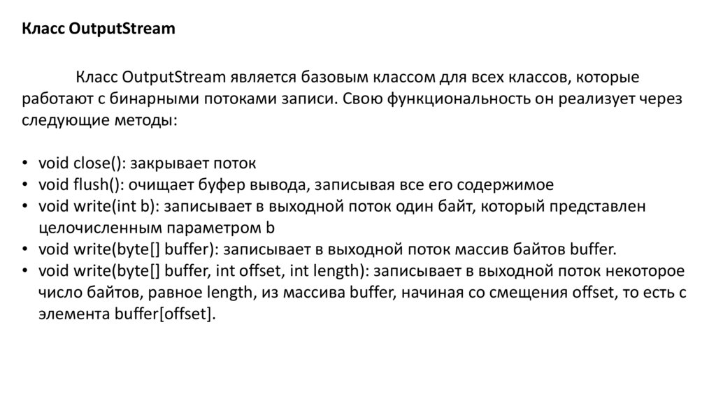 Класс OutputStreamКласс OutputStream является базовым классом для всех классов, которые