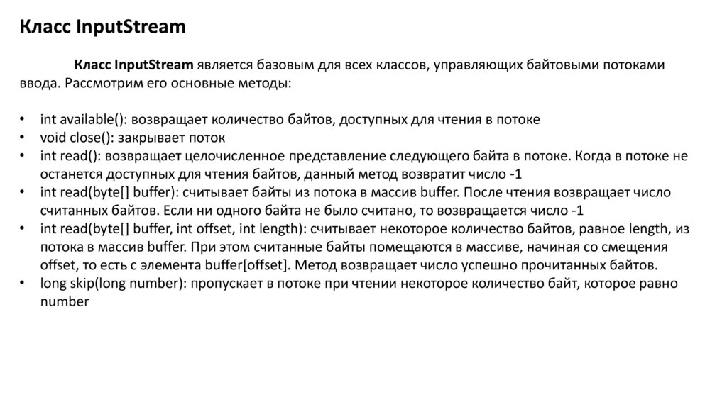• int read(): возвращает целочисленное представление следующего байта в потоке. Когда в потоке не