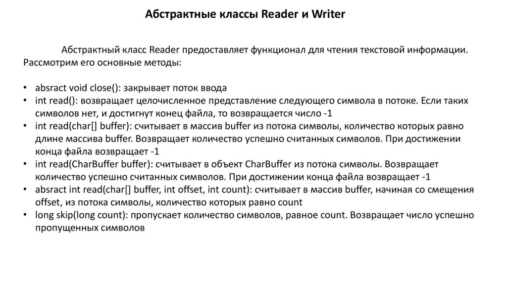 Абстрактные классы Reader и WriterАбстрактный класс Reader предоставляет функционал для чтения текстовой информации.