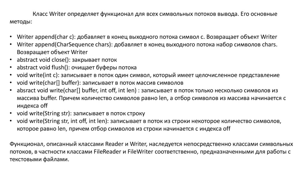 Класс Writer определяет функционал для всех символьных потоков вывода. Его основныеметоды: