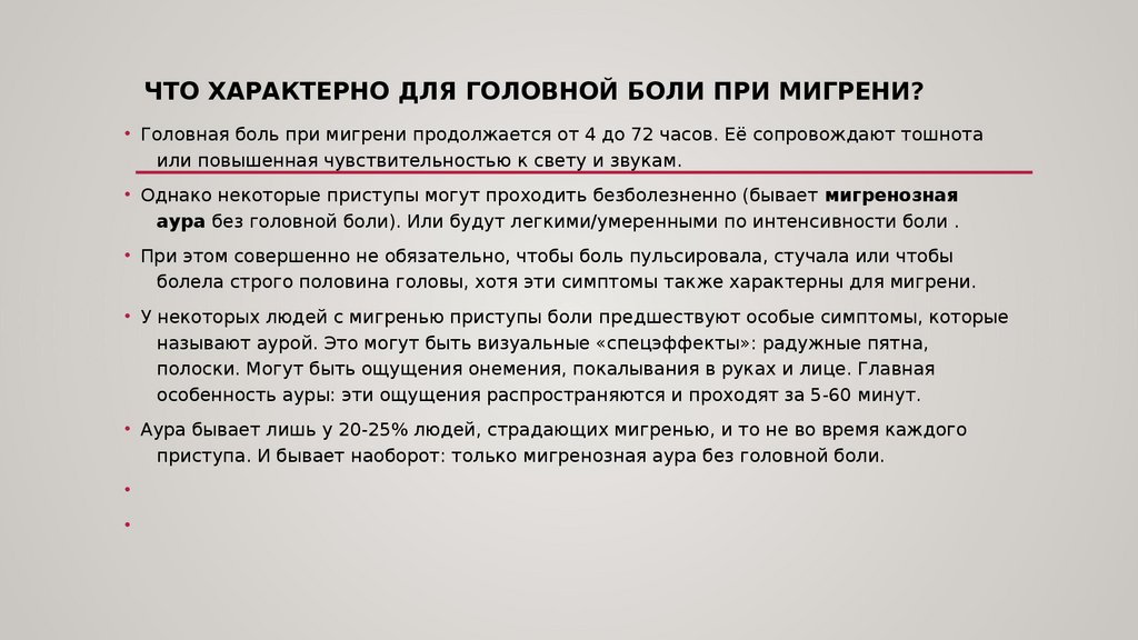 ЧТО ХАРАКТЕРНО ДЛЯ ГОЛОВНОЙ БОЛИ ПРИ МИГРЕНИ?• Головная боль при мигрени продолжается от 4 до 72 часов. Её сопровождают тошнота