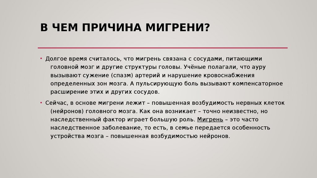 • Сейчас, в основе мигрени лежит – повышенная возбудимость нервных клеток