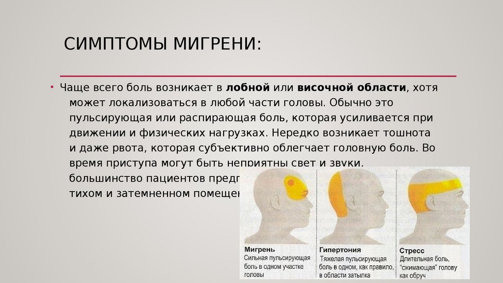 СИМПТОМЫ МИГРЕНИ:• Чаще всего боль возникает в лобной или височной области, хотя