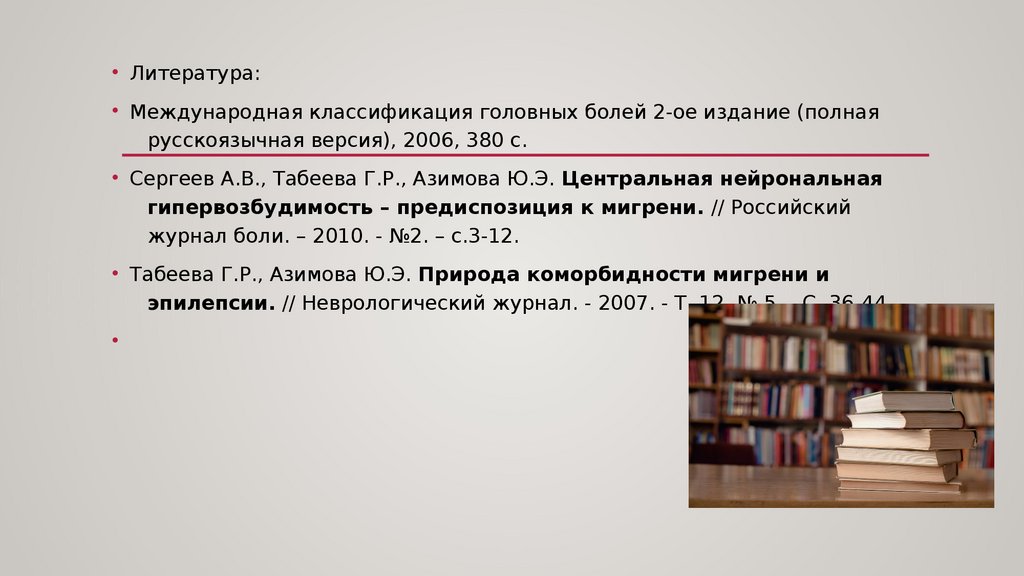 • Литература:• Международная классификация головных болей 2-ое издание (полная