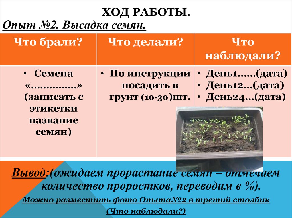 ХОД РАБОТЫ.Опыт №2. Высадка семян.