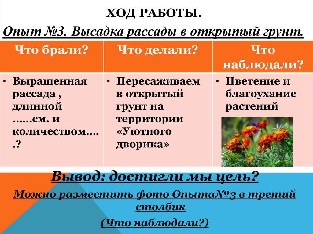 ХОД РАБОТЫ.Опыт №3. Высадка рассады в открытый грунт.