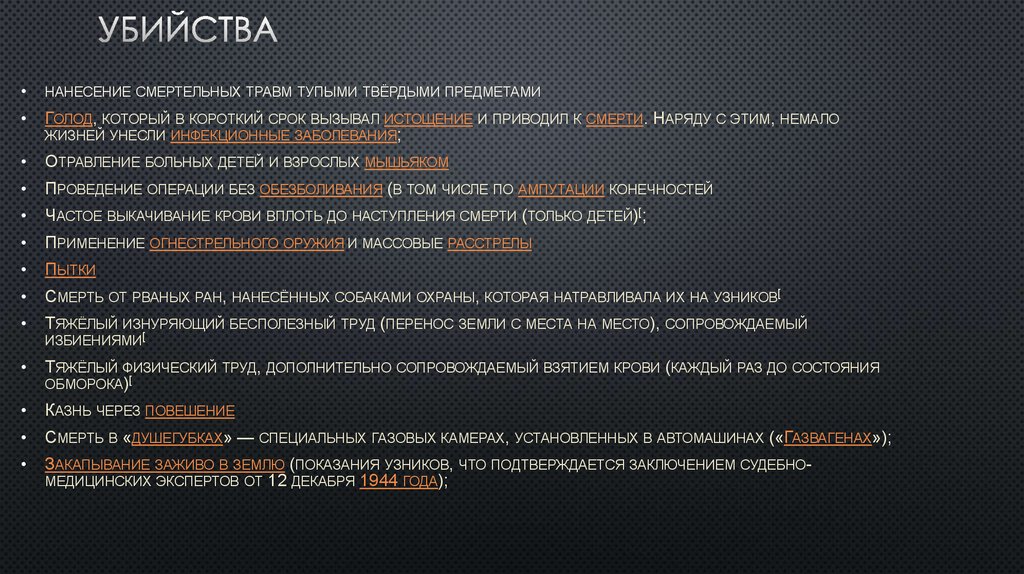 ЗАКАПЫВАНИЕ ЗАЖИВО В ЗЕМЛЮ (ПОКАЗАНИЯ УЗНИКОВ, ЧТО ПОДТВЕРЖДАЕТСЯ ЗАКЛЮЧЕНИЕМ СУДЕБНОМЕДИЦИНСКИХ ЭКСПЕРТОВ ОТ 12 ДЕКАБРЯ 1944 ГОДА);