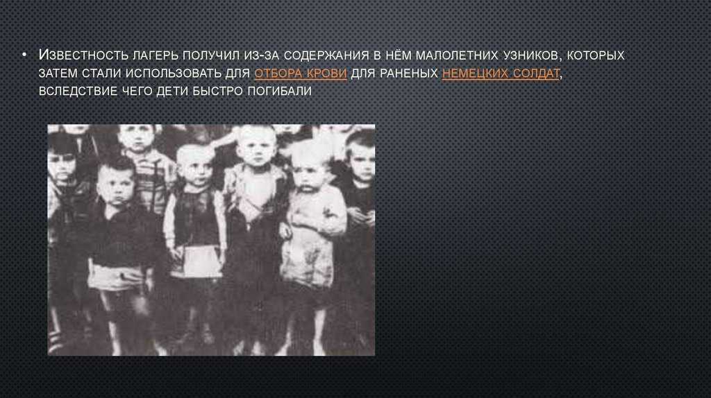 • ИЗВЕСТНОСТЬ ЛАГЕРЬ ПОЛУЧИЛ ИЗ-ЗА СОДЕРЖАНИЯ В НЁМ МАЛОЛЕТНИХ УЗНИКОВ, КОТОРЫХЗАТЕМ СТАЛИ ИСПОЛЬЗОВАТЬ ДЛЯ ОТБОРА КРОВИ ДЛЯ РАНЕНЫХ НЕМЕЦКИХ СОЛДАТ,