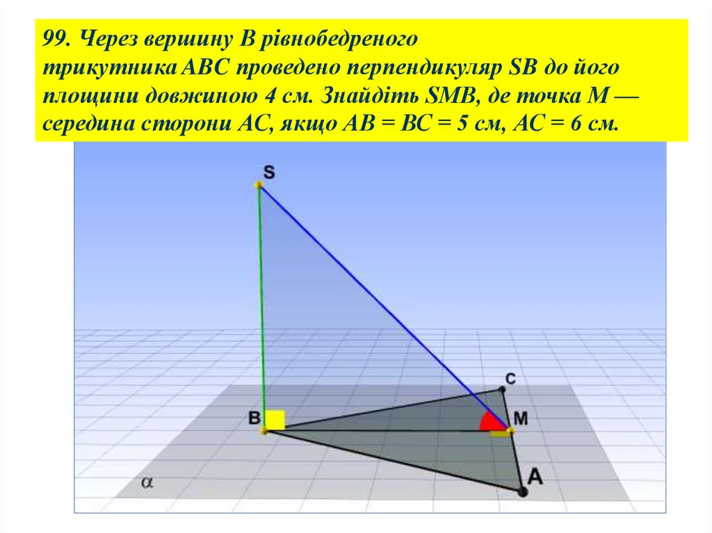 99. Через вершину В рівнобедреноготрикутника ABC проведено перпендикуляр SB до його