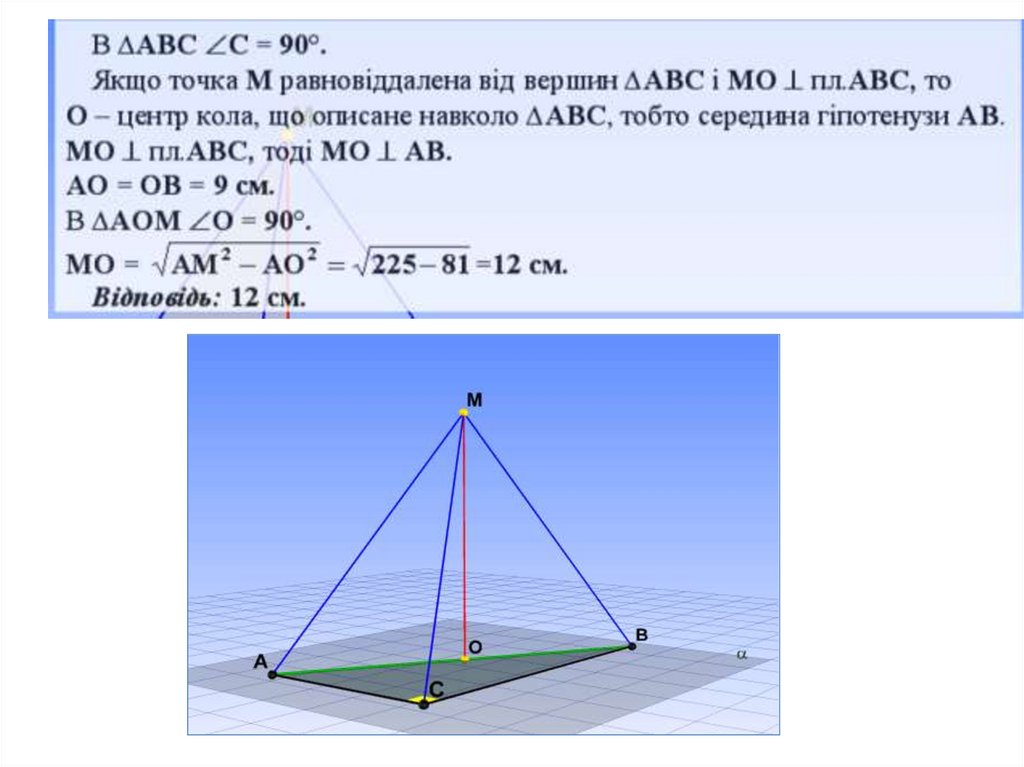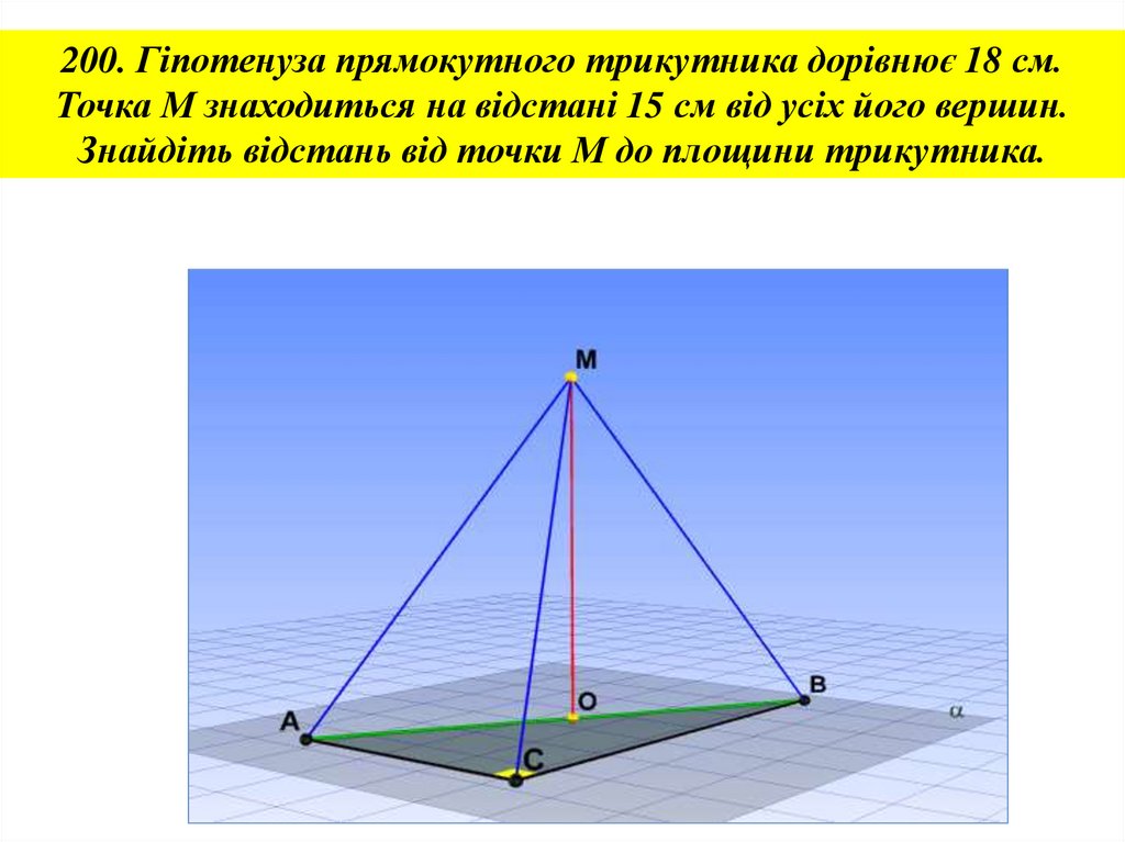 200. Гіпотенуза прямокутного трикутника дорівнює 18 см.Точка М знаходиться на відстані 15 см від усіх його вершин.