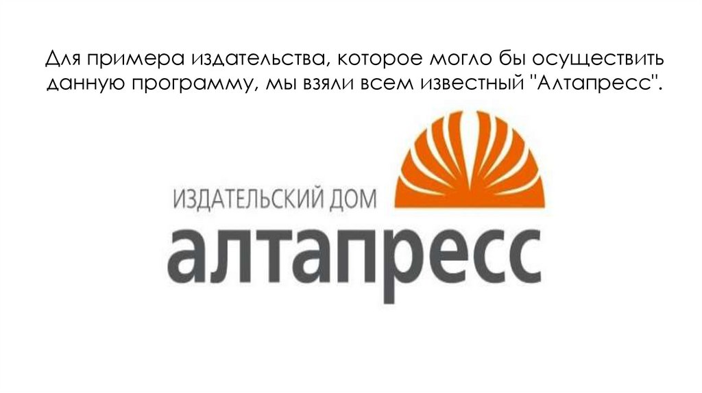 Для примера издательства, которое могло бы осуществитьданную программу, мы взяли всем известный "Алтапресс".