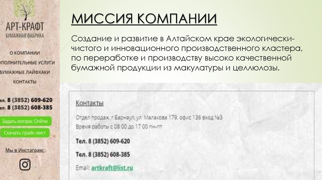 МИССИЯ КОМПАНИИСоздание и развитие в Алтайском крае экологическичистого и инновационного производственного кластера,