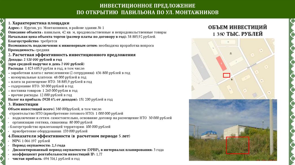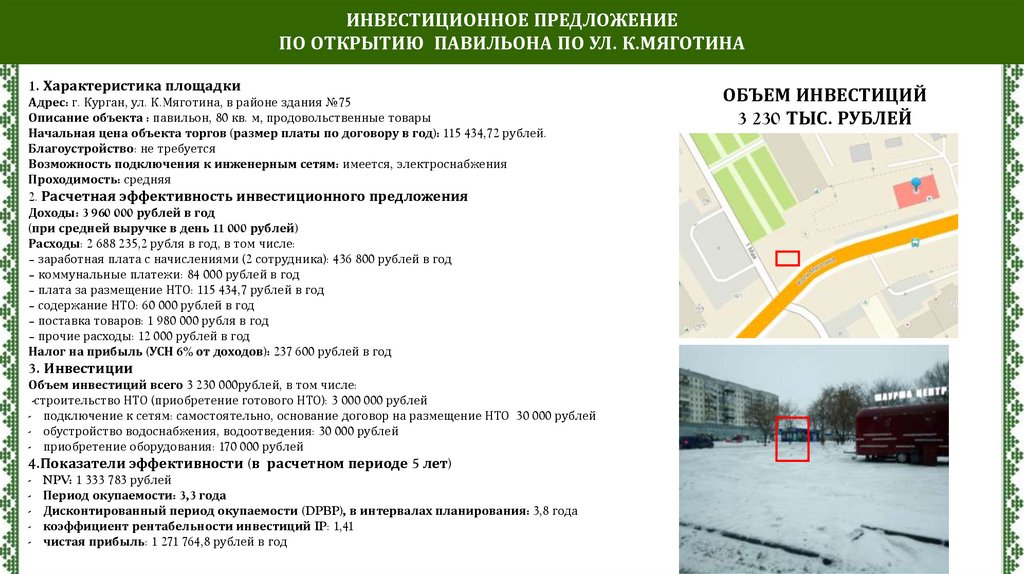 ИНВЕСТИЦИОННОЕ ПРЕДЛОЖЕНИЕПО ОТКРЫТИЮ ПАВИЛЬОНА ПО УЛ. К.МЯГОТИНА