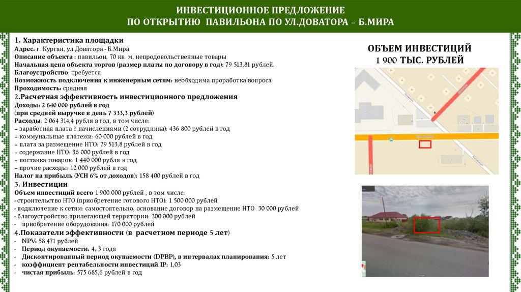 ИНВЕСТИЦИОННОЕ ПРЕДЛОЖЕНИЕПО ОТКРЫТИЮ ПАВИЛЬОНА ПО УЛ.ДОВАТОРА – Б.МИРА
