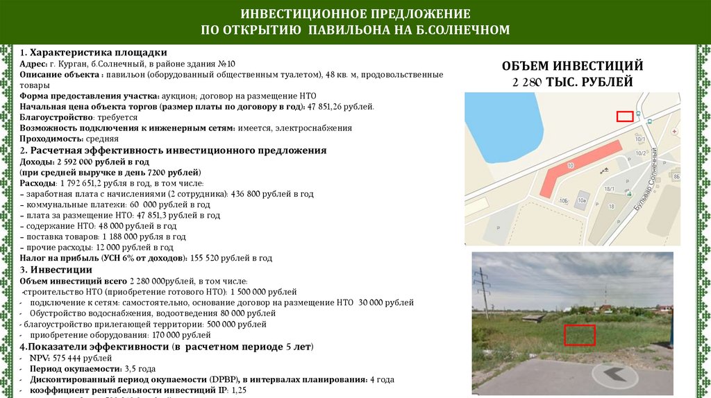 ИНВЕСТИЦИОННОЕ ПРЕДЛОЖЕНИЕПО ОТКРЫТИЮ ПАВИЛЬОНА НА Б.СОЛНЕЧНОМ