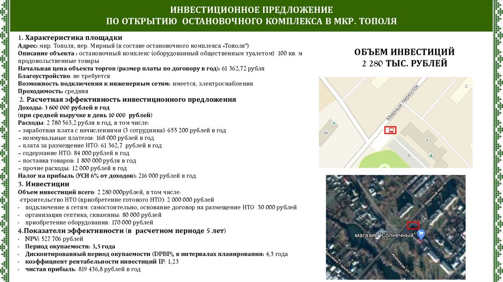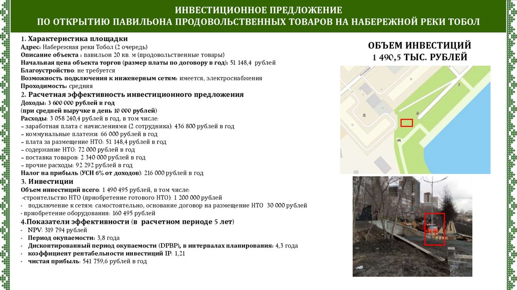ИНВЕСТИЦИОННОЕ ПРЕДЛОЖЕНИЕПО ОТКРЫТИЮ ПАВИЛЬОНА ПРОДОВОЛЬСТВЕННЫХ ТОВАРОВ НА НАБЕРЕЖНОЙ РЕКИ ТОБОЛ