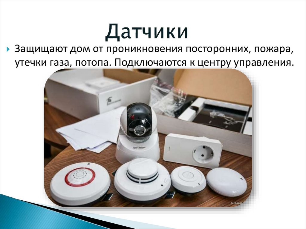 Защищают дом от проникновения посторонних, пожара,утечки газа, потопа. Подключаются к центру управления.
