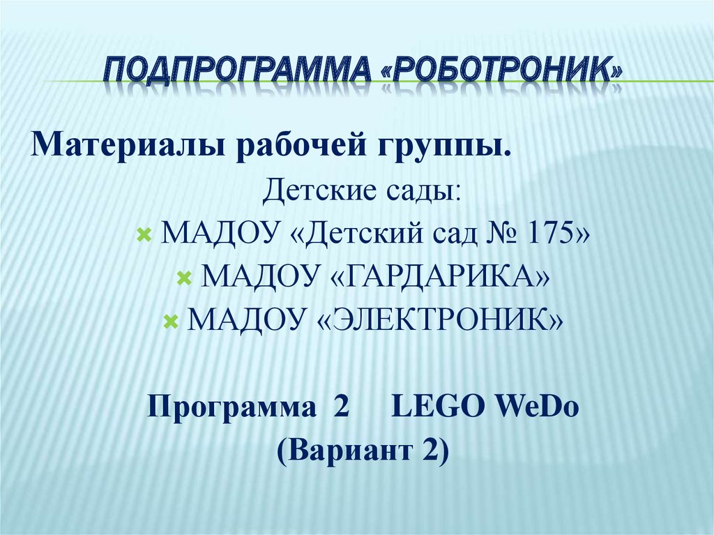 Подпрограмма «роботроник». Материалы рабочей группы ДОУ г. Перми