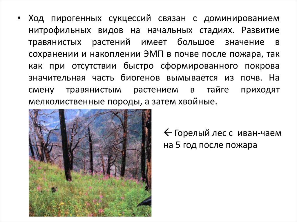 • Ход пирогенных сукцессий связан с доминированиемнитрофильных видов на начальных стадиях. Развитие