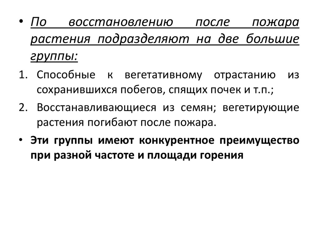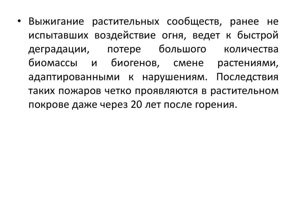 • Выжигание растительных сообществ, ранее неиспытавших воздействие огня, ведет к быстрой