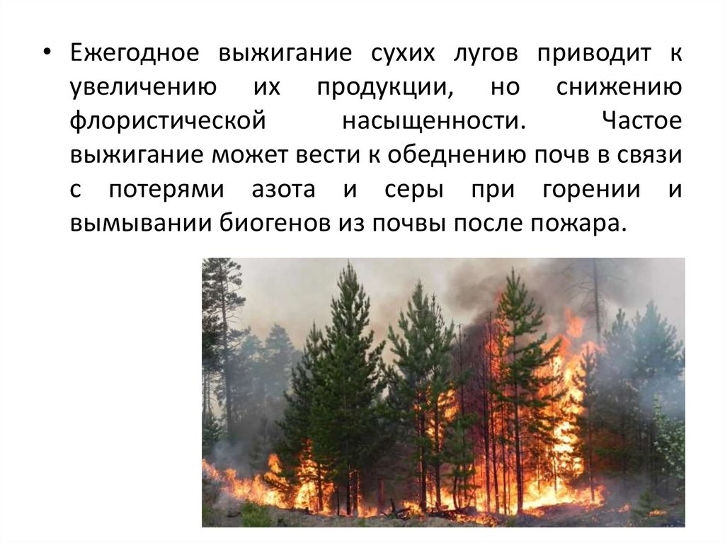 • Ежегодное выжигание сухих лугов приводит кувеличению их продукции, но снижению