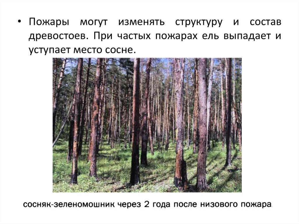 • Пожары могут изменять структуру и составдревостоев. При частых пожарах ель выпадает и