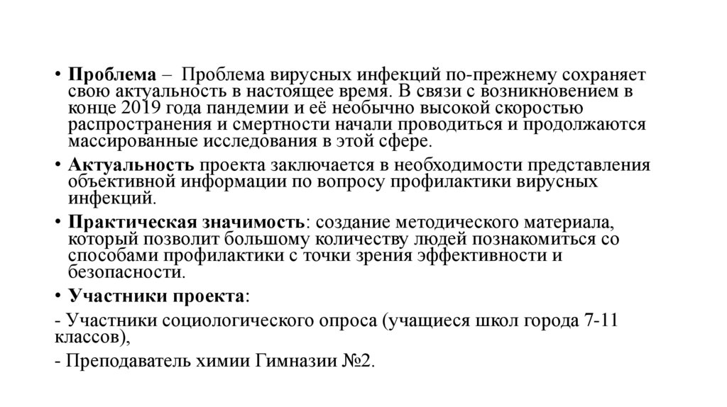 • Проблема – Проблема вирусных инфекций по-прежнему сохраняетсвою актуальность в настоящее время. В связи с возникновением в