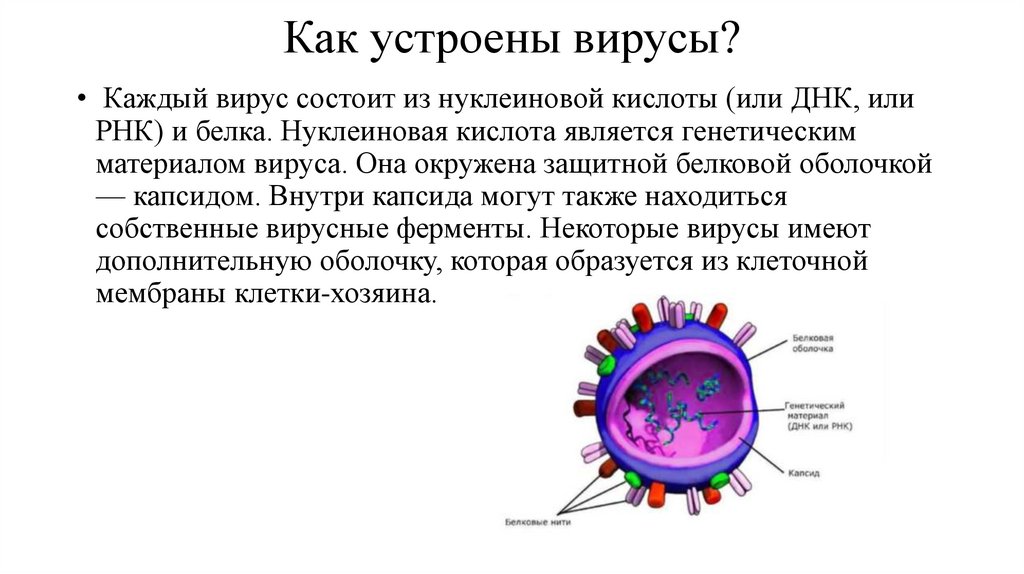 Как устроены вирусы?• Каждый вирус состоит из нуклеиновой кислоты (или ДНК, или