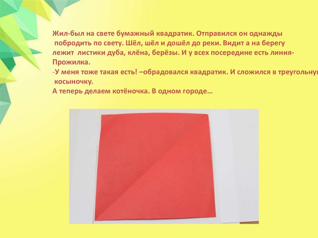 Жил-был на свете бумажный квадратик. Отправился он однаждыпобродить по свету. Шёл, шёл и дошёл до реки. Видит а на берегу