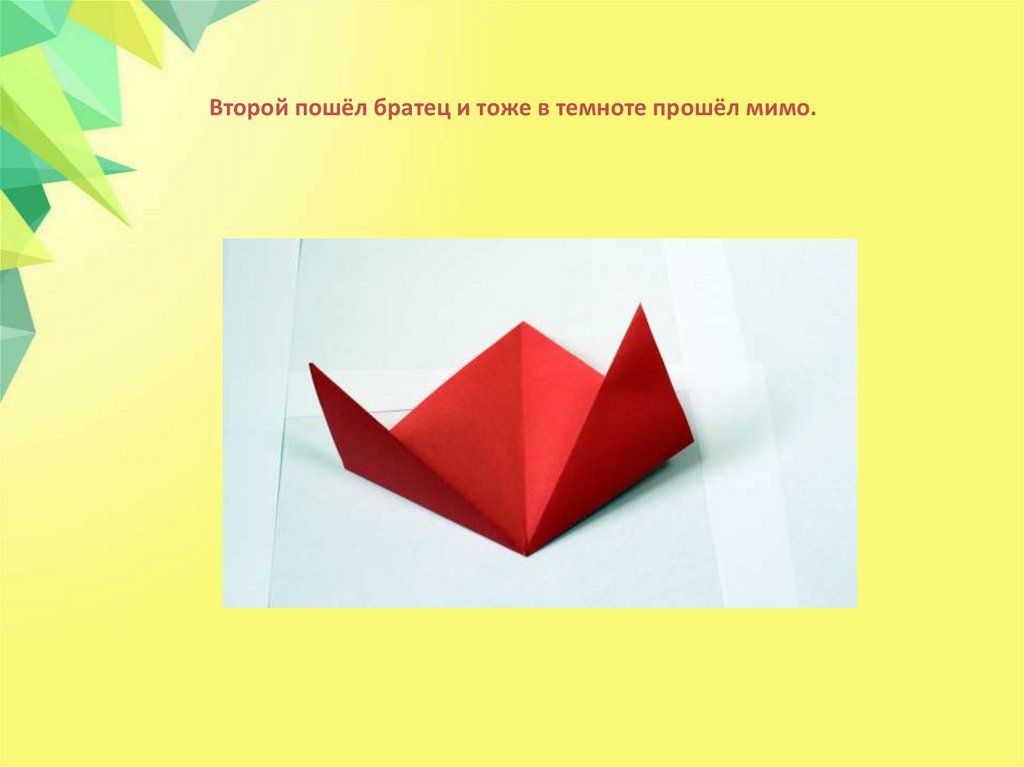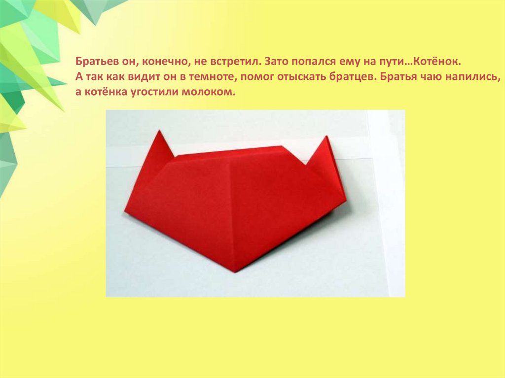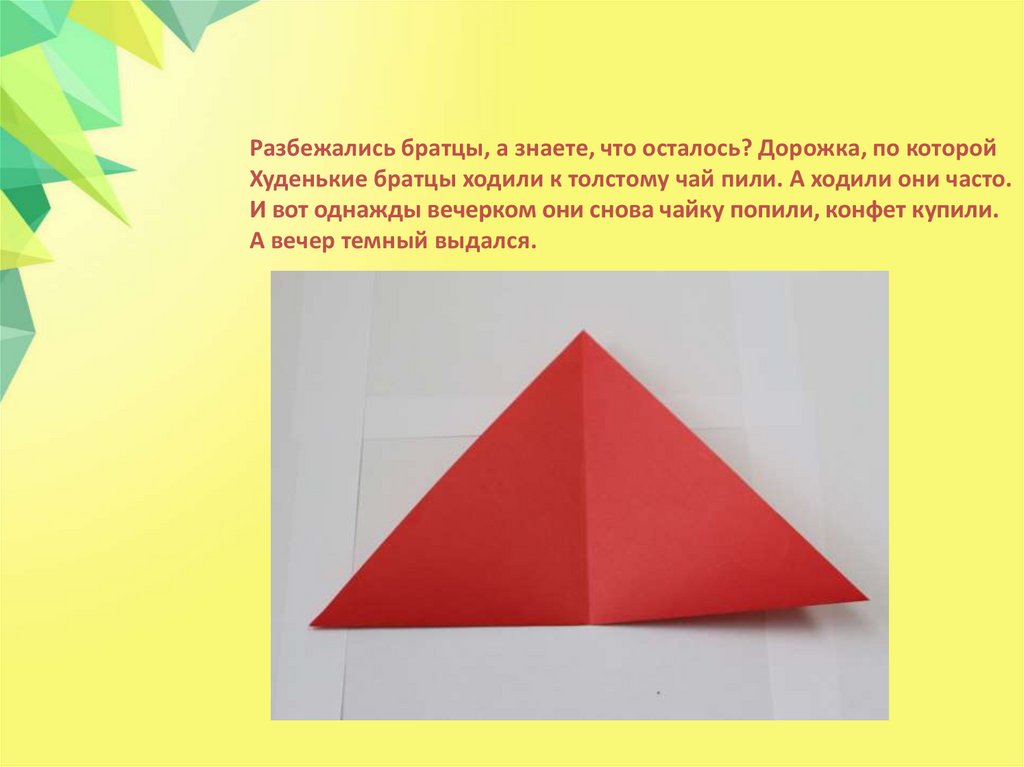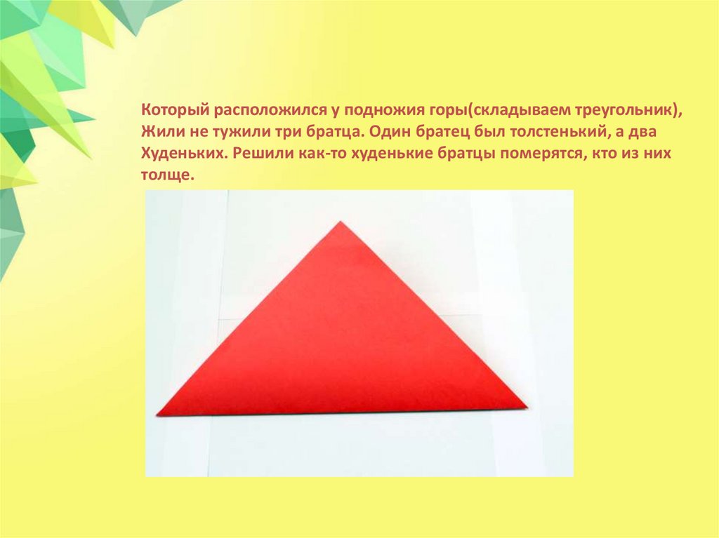 Который расположился у подножия горы(складываем треугольник),Жили не тужили три братца. Один братец был толстенький, а два