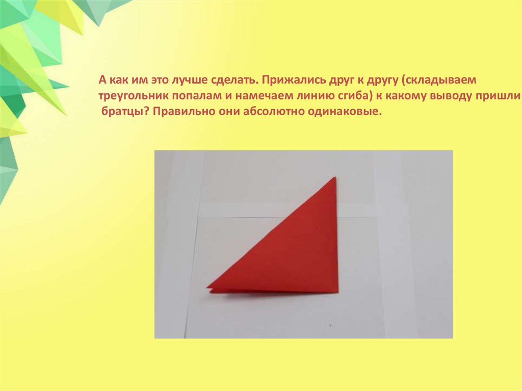 А как им это лучше сделать. Прижались друг к другу (складываемтреугольник попалам и намечаем линию сгиба) к какому выводу пришли