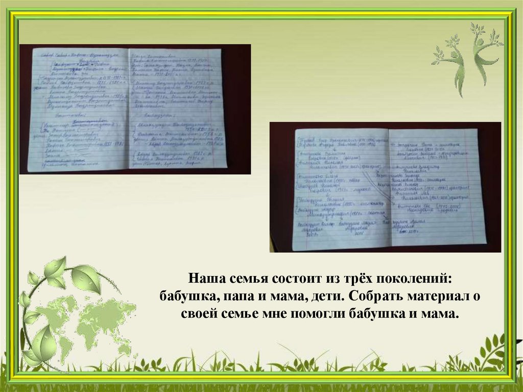 Наша семья состоит из трёх поколений:бабушка, папа и мама, дети. Собрать материал о