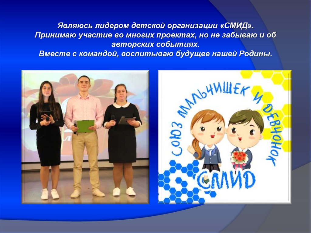 Являюсь лидером детской организации «СМИД».Принимаю участие во многих проектах, но не забываю и об
