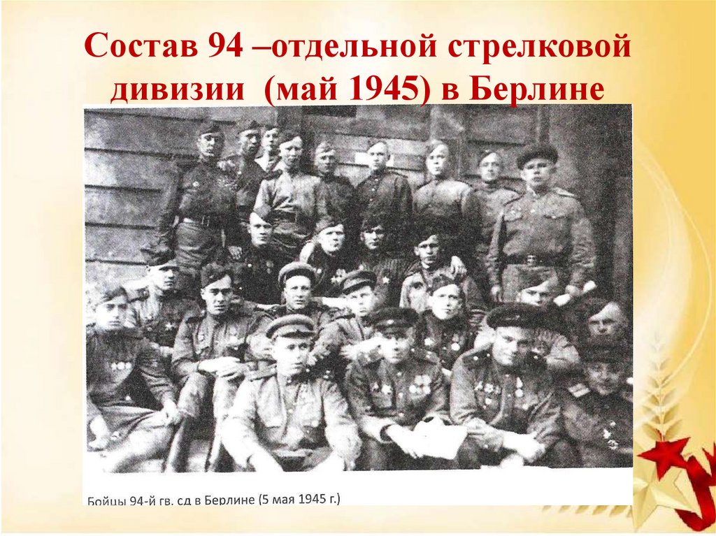 Состав 94 –отдельной стрелковойдивизии (май 1945) в Берлине