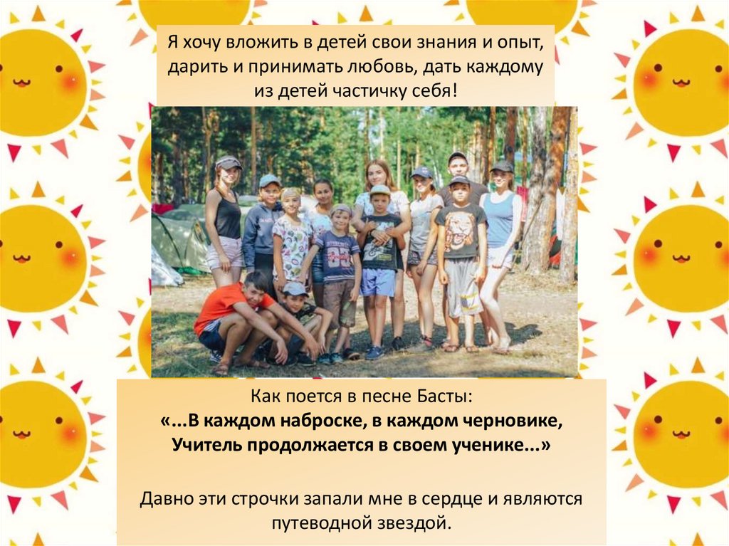 Я хочу вложить в детей свои знания и опыт,дарить и принимать любовь, дать каждому