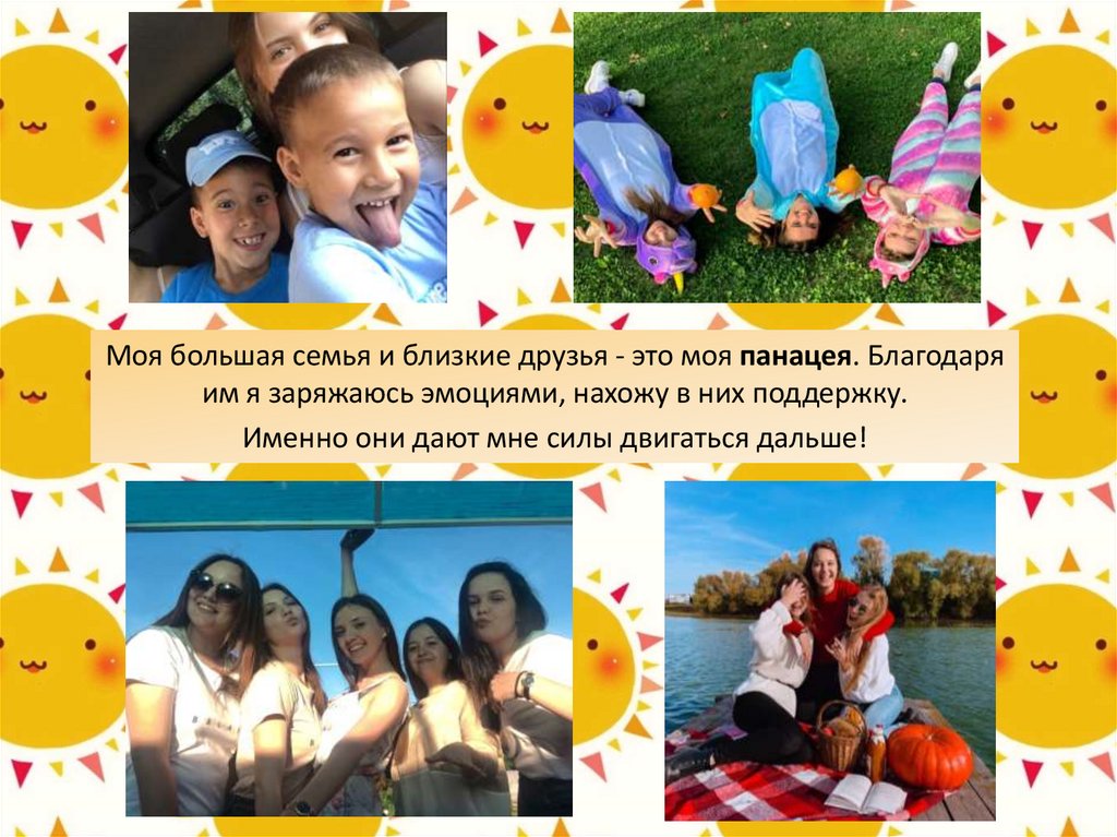 Моя большая семья и близкие друзья - это моя панацея. Благодаряим я заряжаюсь эмоциями, нахожу в них поддержку.