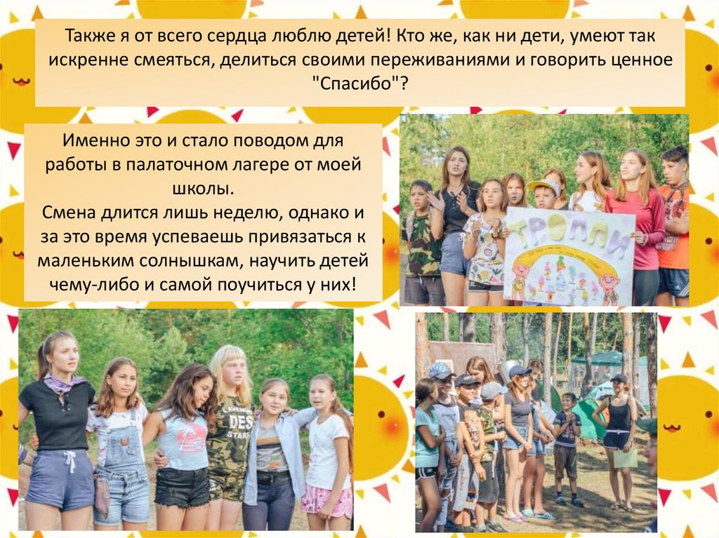 Также я от всего сердца люблю детей! Кто же, как ни дети, умеют такискренне смеяться, делиться своими переживаниями и говорить ценное