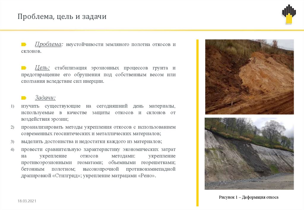Проблема, цель и задачиПроблема: неустойчивости земляного полотна откосов и