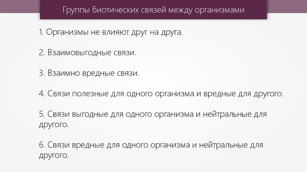 Группы биотических связей между организмами1. Организмы не влияют друг на друга.