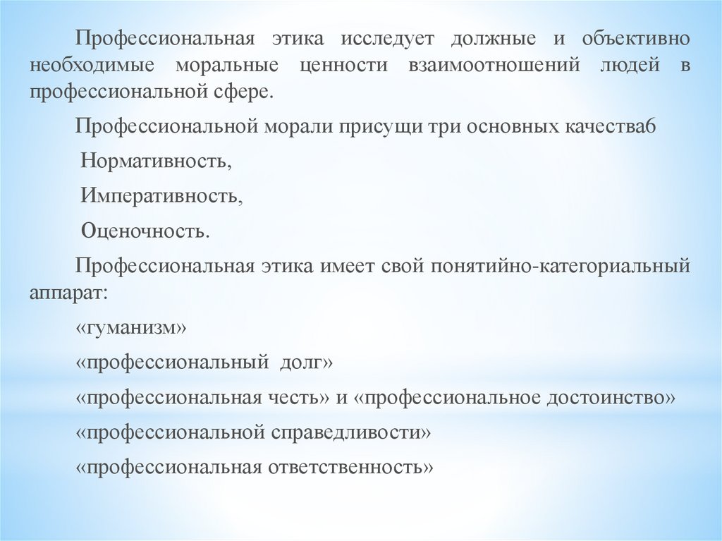 Профессиональная этика исследует должные и объективнонеобходимые моральные ценности взаимоотношений людей в