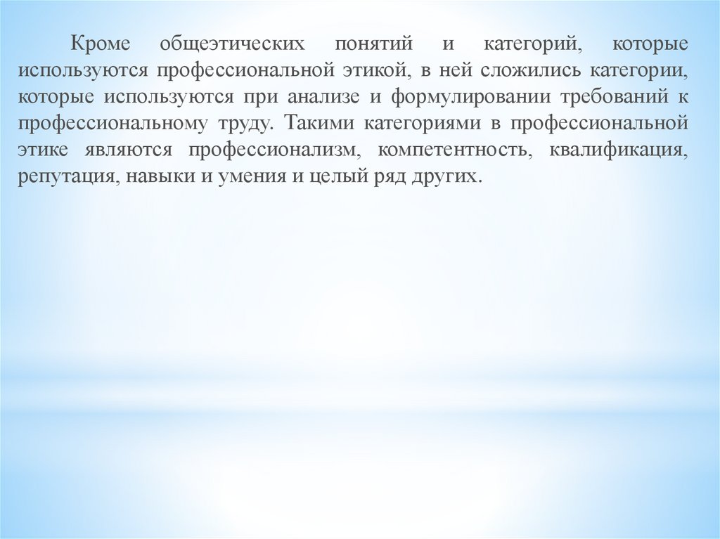 Кроме общеэтических понятий и категорий, которыеиспользуются профессиональной этикой, в ней сложились категории,