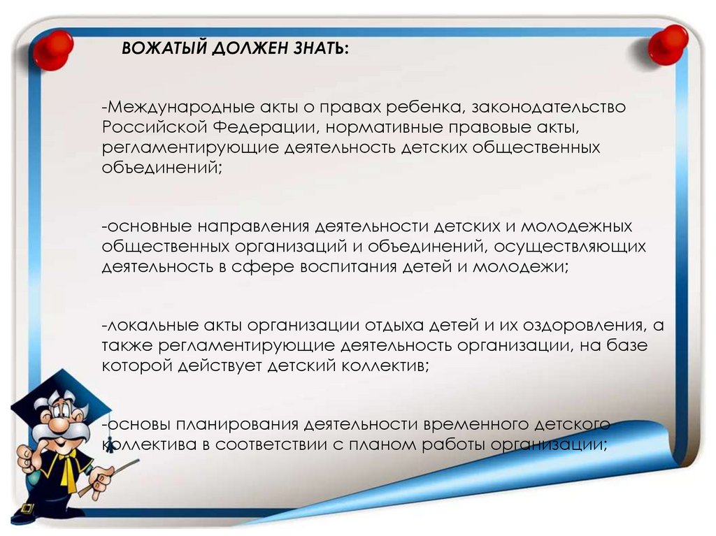 ВОЖАТЫЙ ДОЛЖЕН ЗНАТЬ:-Международные акты о правах ребенка, законодательство