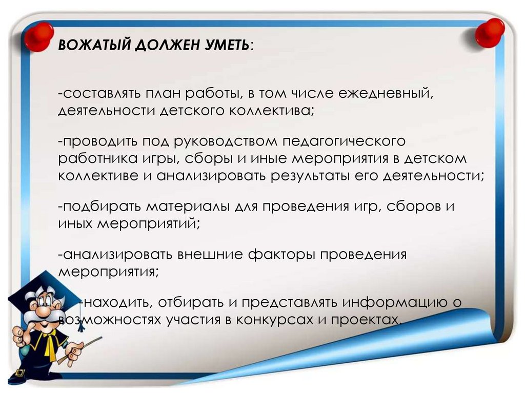 ВОЖАТЫЙ ДОЛЖЕН УМЕТЬ:-составлять план работы, в том числе ежедневный,