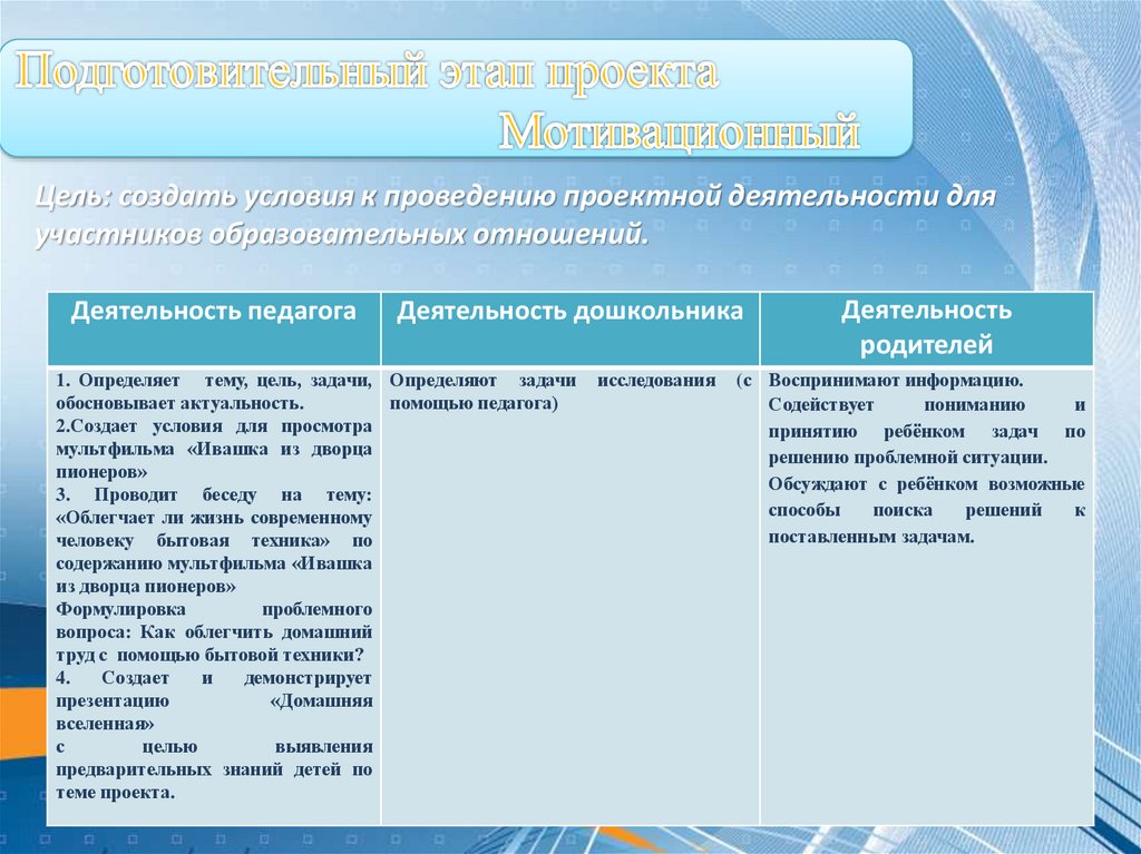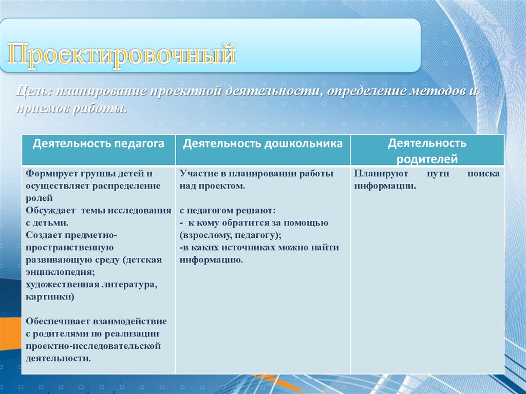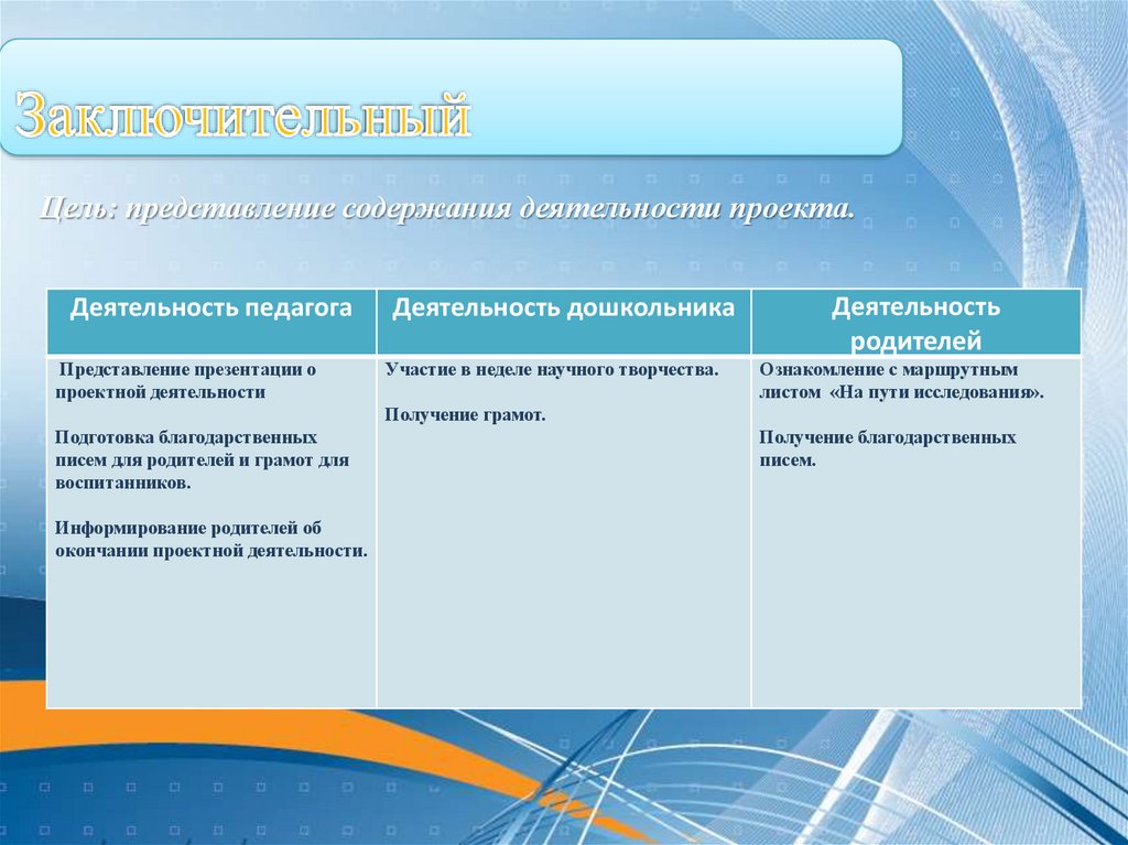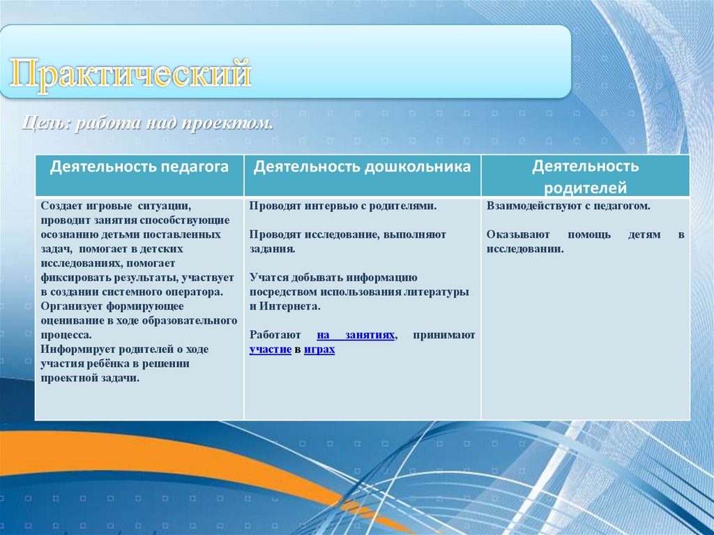 Цель: представление содержания деятельности проекта.Деятельность педагога