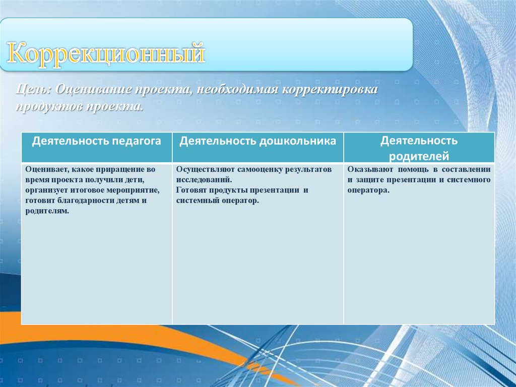 Цель: Оценивание проекта, необходимая корректировкапродуктов проекта.