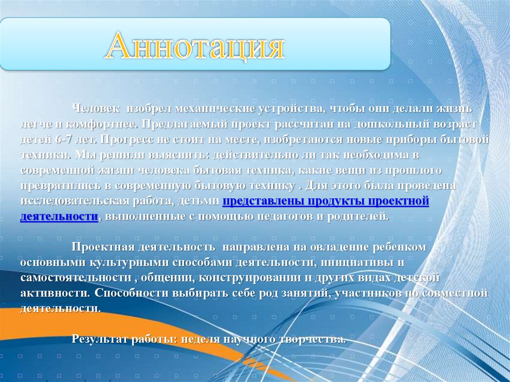 Человек изобрел механические устройства, чтобы они делали жизньлегче и комфортнее. Предлагаемый проект рассчитан на дошкольный возраст