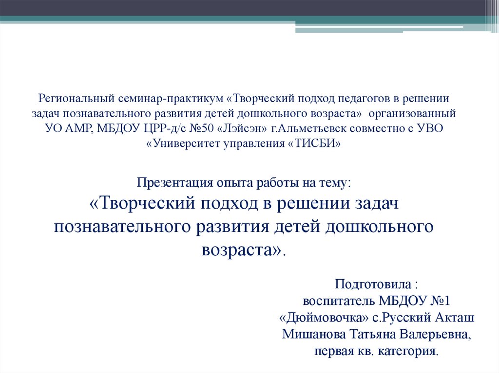 Региональный семинар-практикум «Творческий подход педагогов в решениизадач познавательного развития детей дошкольного возраста» организованный