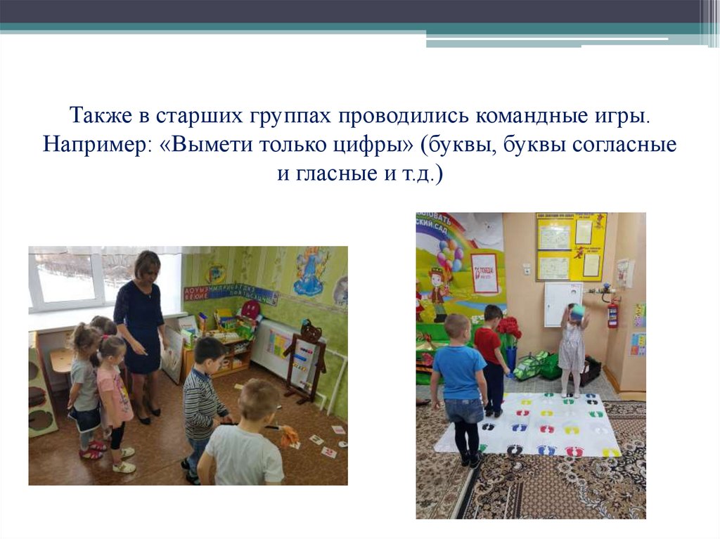 Также в старших группах проводились командные игры.Например: «Вымети только цифры» (буквы, буквы согласные