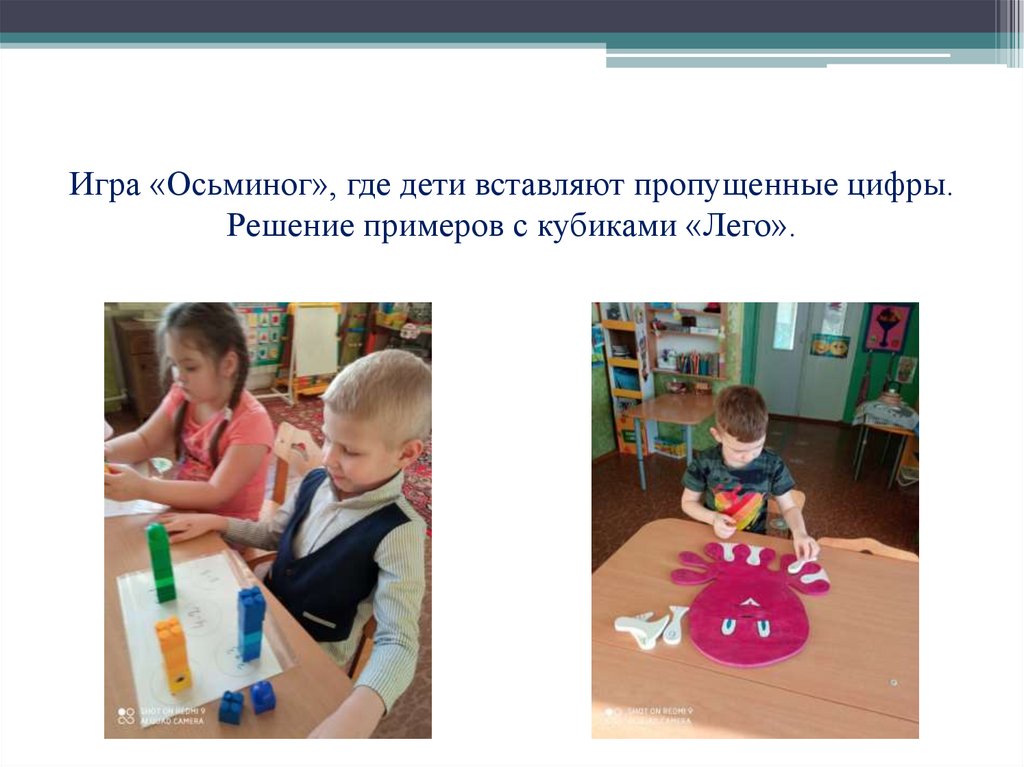 Игра «Осьминог», где дети вставляют пропущенные цифры.Решение примеров с кубиками «Лего».
